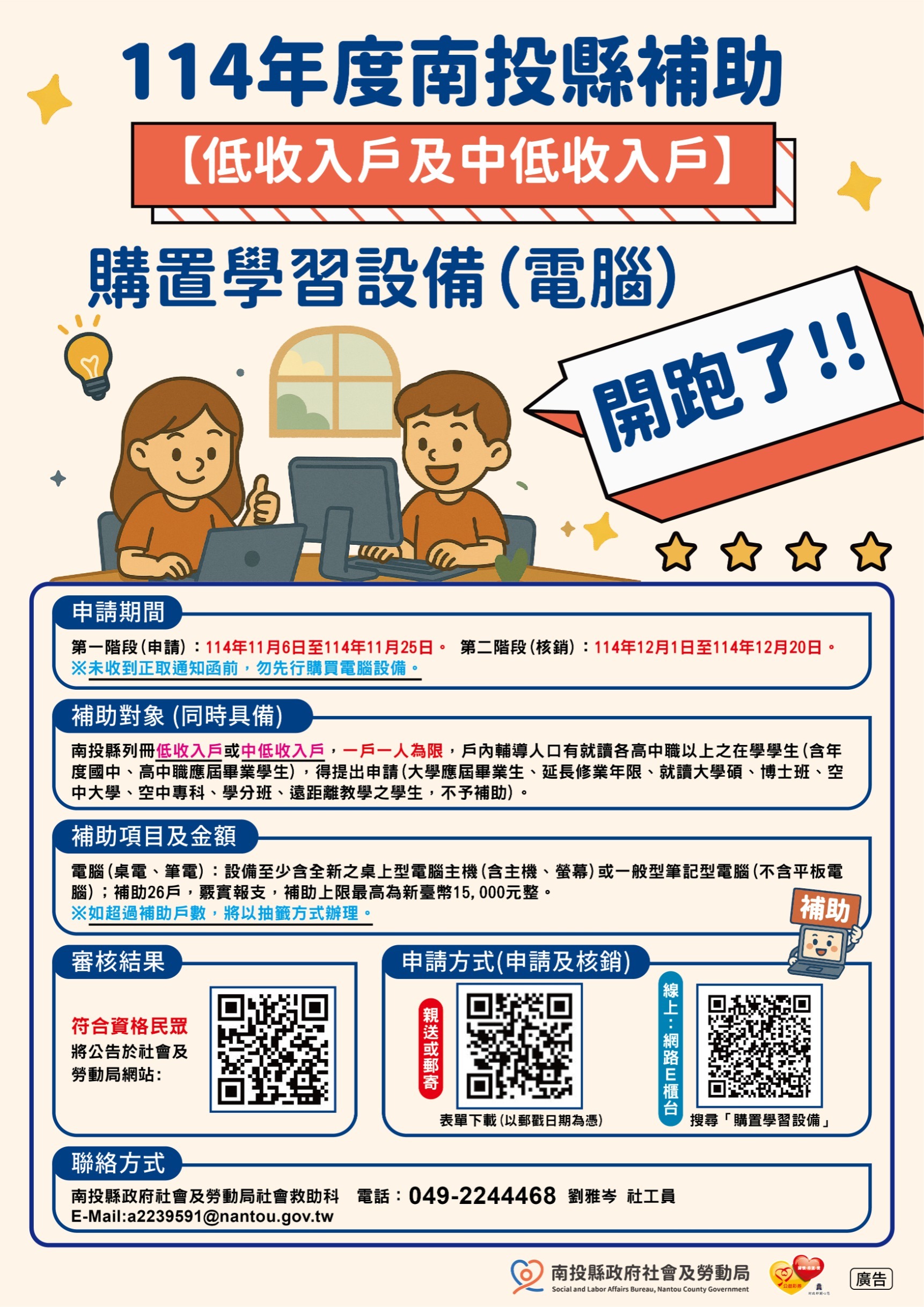 南投縣多元脫貧服務-補助低收入戶及中低收入戶購置學習設備計畫